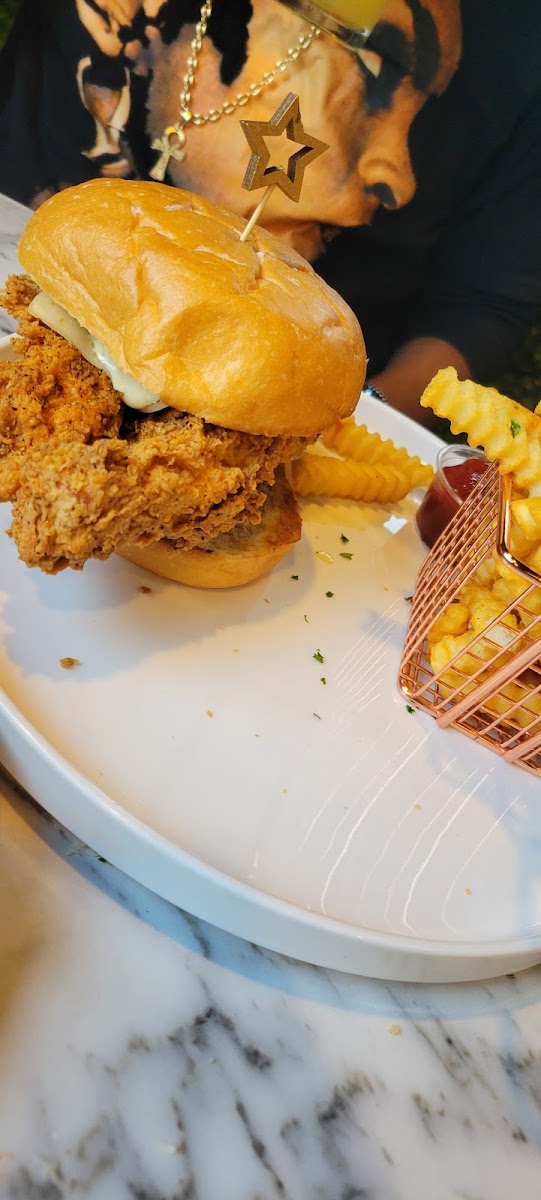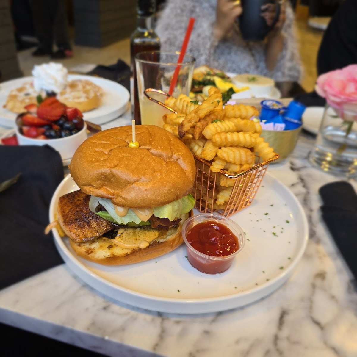 “ 10/10 service, ambience and atmosphere. Breakfast Burger: 7.5/10- good, big burger. But, I've had this burger before elsewhere with more flavor. Chicken and waffles: 8/10- excellent presentation, waffles had good flavor, chicken had a beautiful looking, crunchy fry. But the chicken flavor, which should be the star of the show, lacked a punchy flavor. Overall, I could recommend this place for its atmosphere and its cocktail selection. But is it "Flavor Rich"? Maybe the other food options might have more depth of flavor. ”